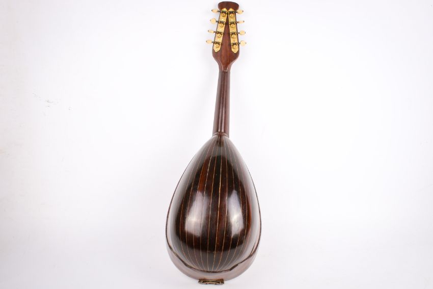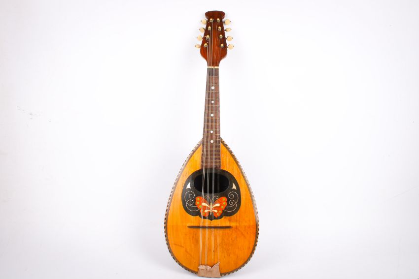 A 20th century bow back Neopolitan mandolin and case. Unlabelled, with inlaid butterfly decoration, total length 61cm