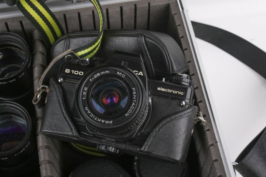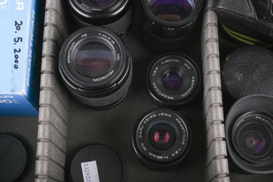 A Praktica B100 35mm SLR camera and assortment of bayonet Praktica mount lenses. To include two Carl Zeiss Jena 135mm f2.8; two Pentacon 55-200mm f4-5.6; a Carl Zeiss Jena 35mm f2.4; a Pentacon 50mm f2.4; a Pentacon 28mm f2.8; and more. Within aluminium flight case.