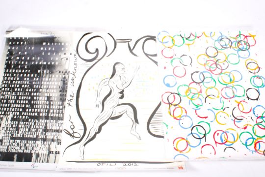 Four London 2012 Olympic Games posters by various contemporary artists. Including Rachel Whitread, Chris Ofili, Martin Creed and Fiona Banner. 60cm x 80cm