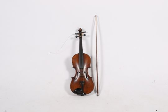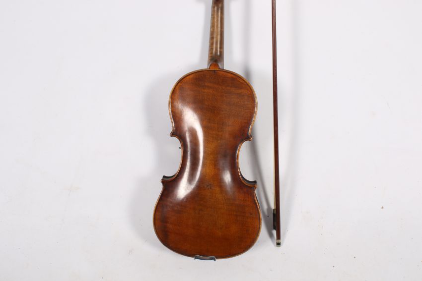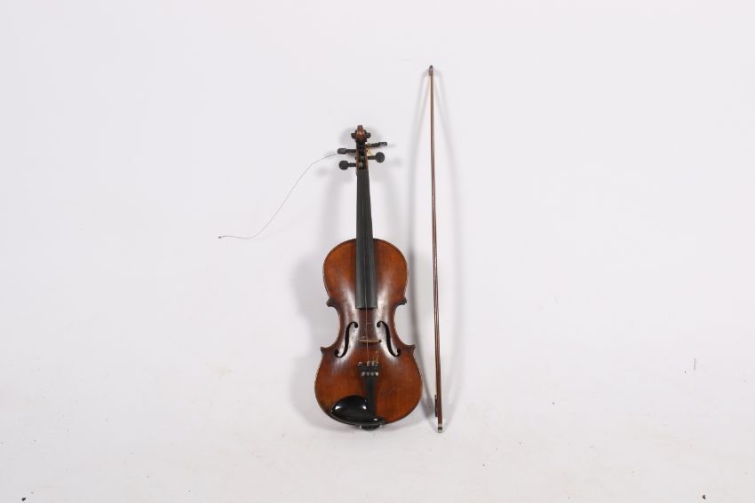 Vintage violin in a fitted wooden coffin shaped case. Comes with a bow. Total length 59cm, body length 36cm
