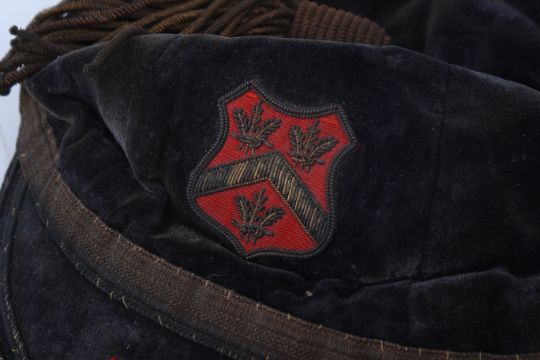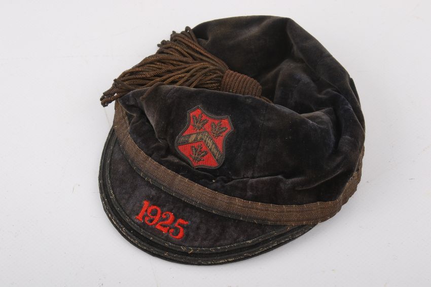 A circa 1925 E.C. Devereux of Eton sporting cap. Constructed of blue velvet with a gilt trim and tassle, bearing a crest and the date '1925' to the front, lined in green fabric with a manufacturers label