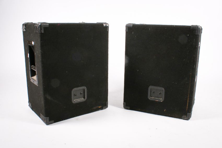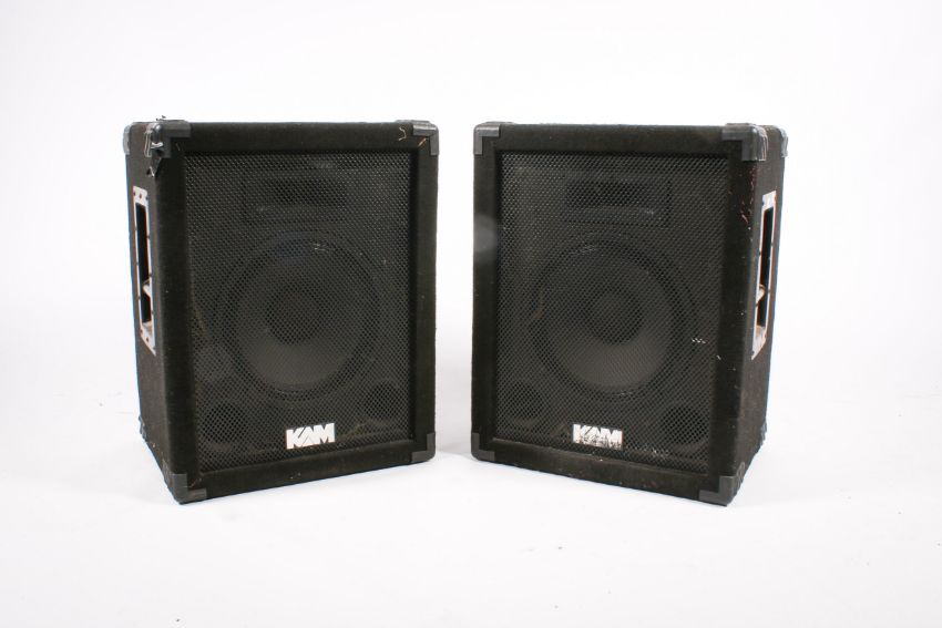 A pair of KAM PA speakers. H60cm x W47cm x D35cm