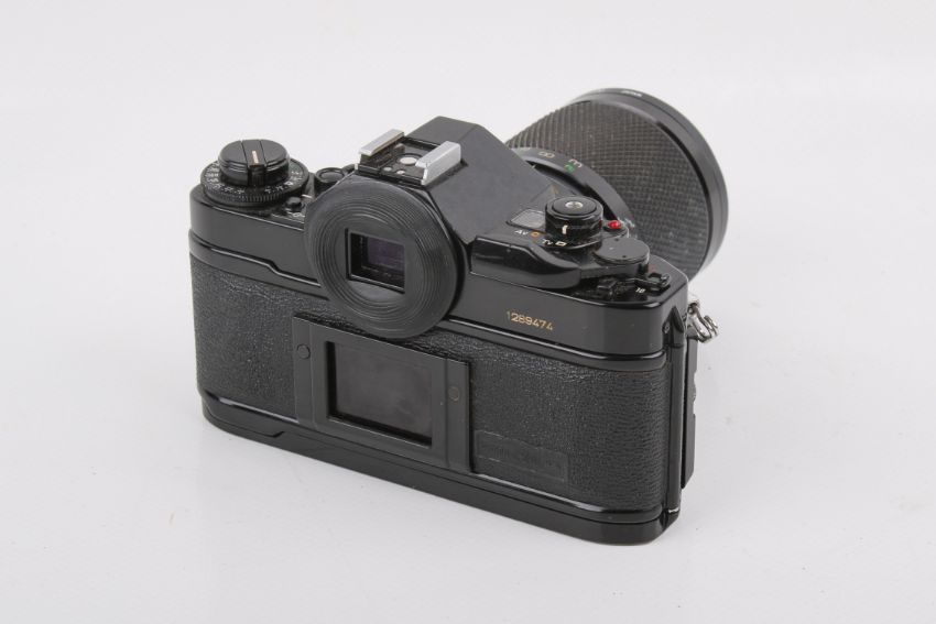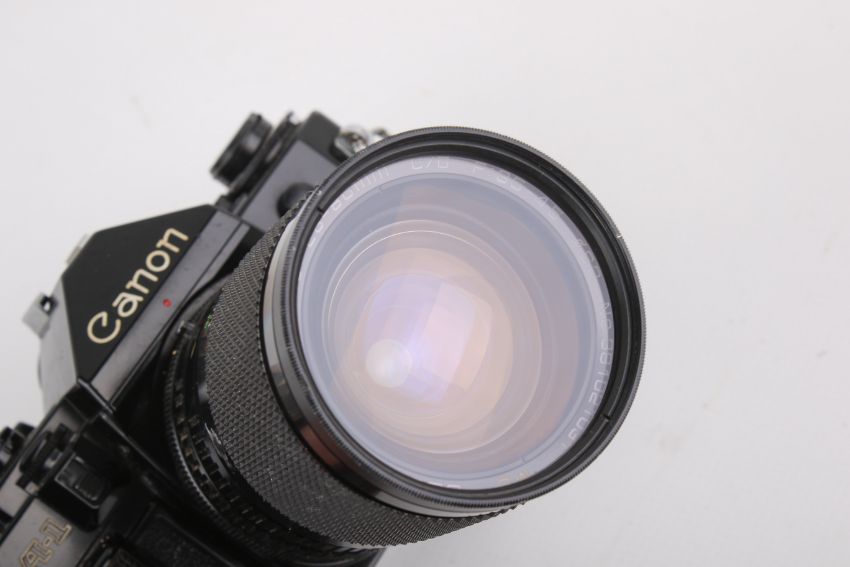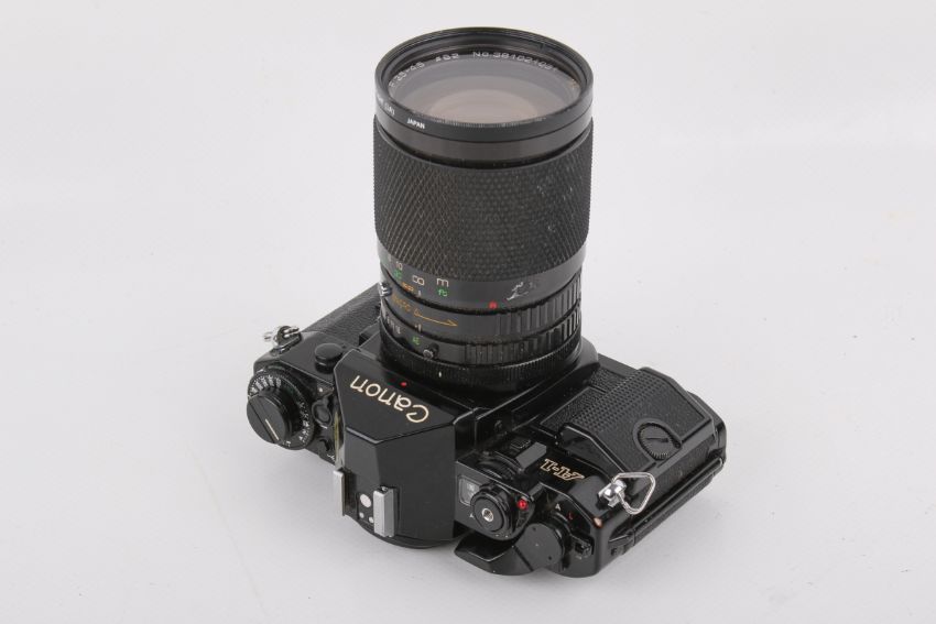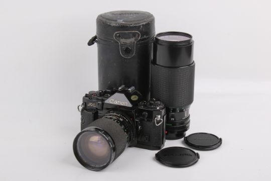 A Canon A1 35mm SLR camera outfit. Black. Serial number 1289474. With two lenses; a Canon Zoom FD 70-210mm f4, optics G, one fungus spore to rear element, functions well; and a Soligor Zoom Macro 28-80mm f3.5-4.5, optics G/VG, functions well. Body untested.