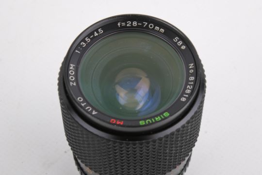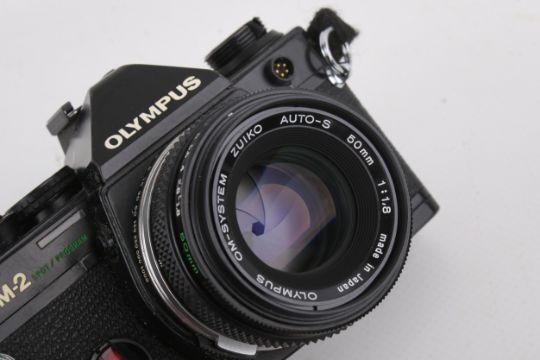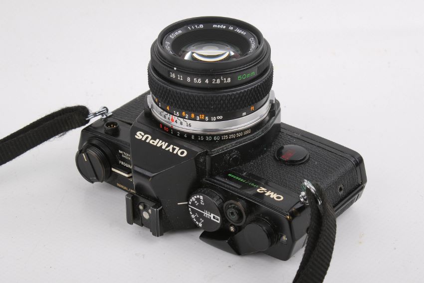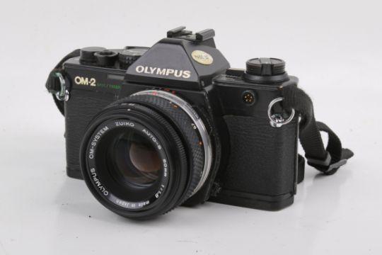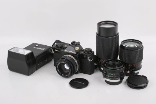An Olympus OM-2 Spot/Program 35mm SLR camera outfit. Black. Serial number 1103634. With four lenses; An Olympus 50mm f1.8 Zuiko Auto-S; a Sirius 28mm f2.8; a Sirius 28-70mm f3.5-4.5; and a Sirius 70-210mm f4. Mirror stuck in up position. Together with instruction manuals and various accessories.