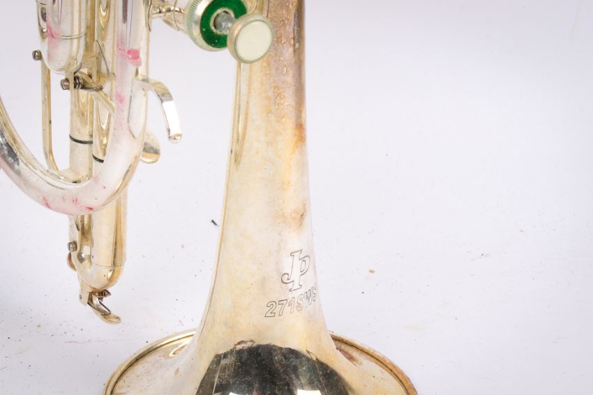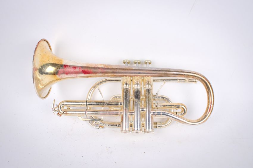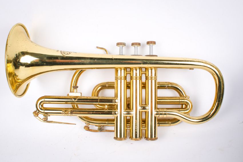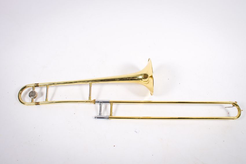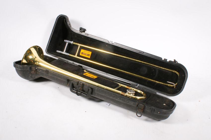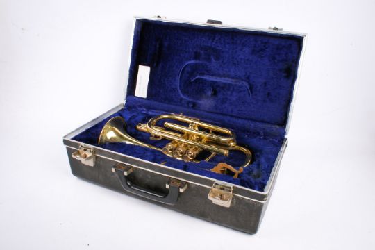 A group of three cased brass musical instruments. Including a Bach trombone, an Amatri Kraslice ACR 201 cornet and JP 271 SWS silver plated cornet.