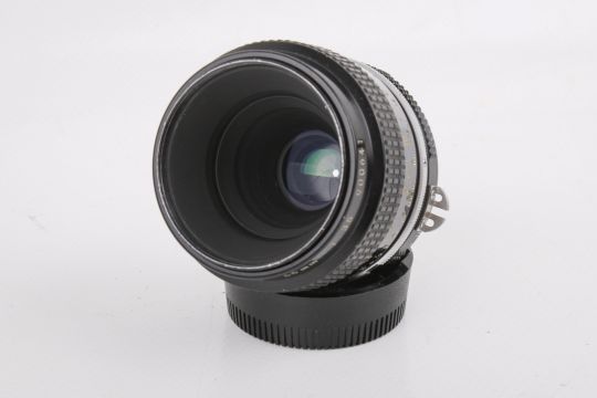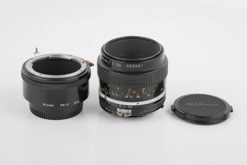 A Nikon 55mm f3.5 Micro-Nikkor lens. Serial number 900641. With Nikon PK-3 27.5 extension tube, and front and rear caps. Optics G, functions well.