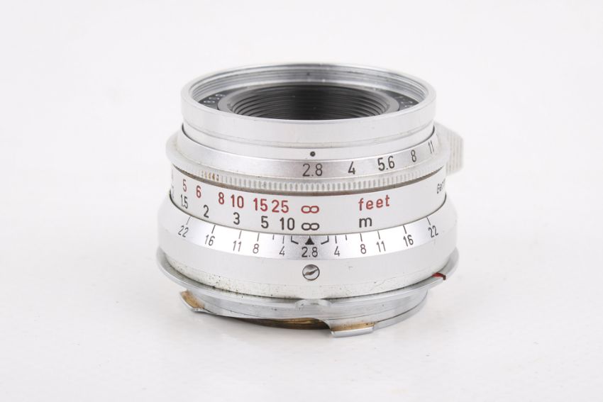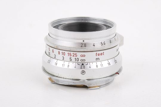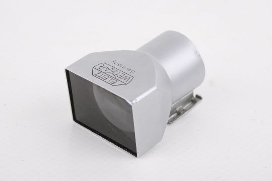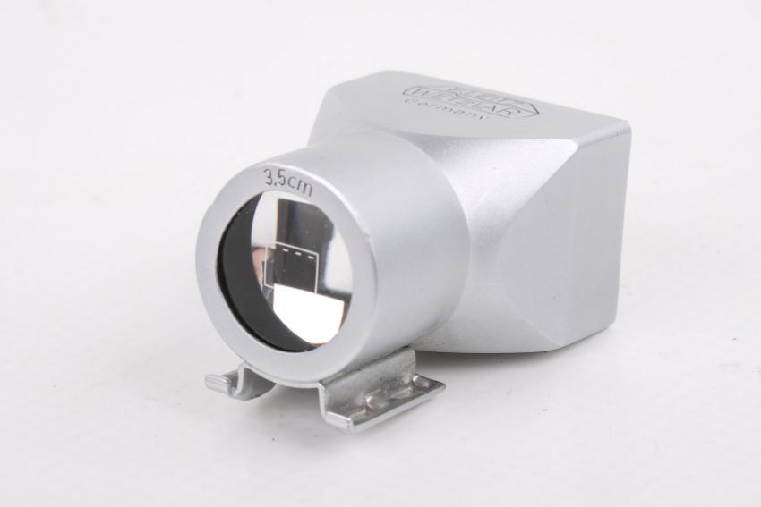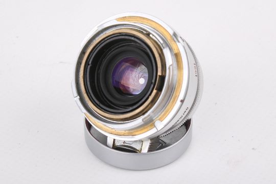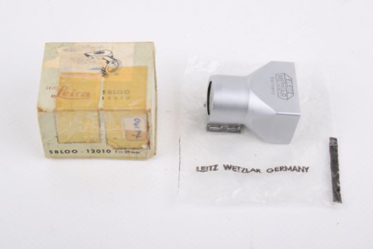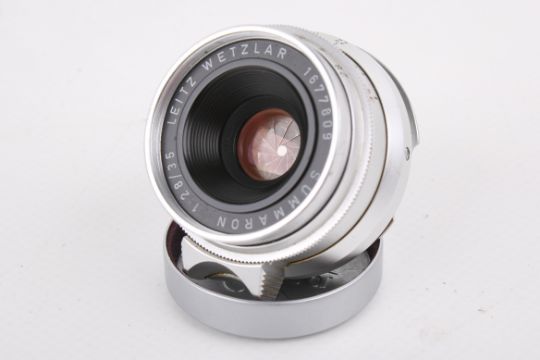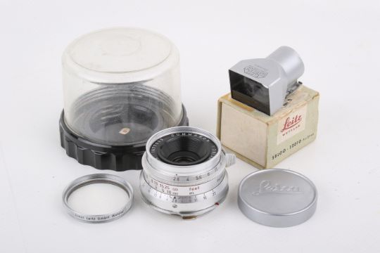 A Leitz 35mm f2.8 Summaron lens and viewfinder set. Leica M mount. Chrome. Serial number 1677809. Optics G, functions well. With front cap, bubble case, and UVa filter. Together with Leitz SBLOO 12010 3,5cm shoe-mount viewfinder. Optics VG, with makers box.