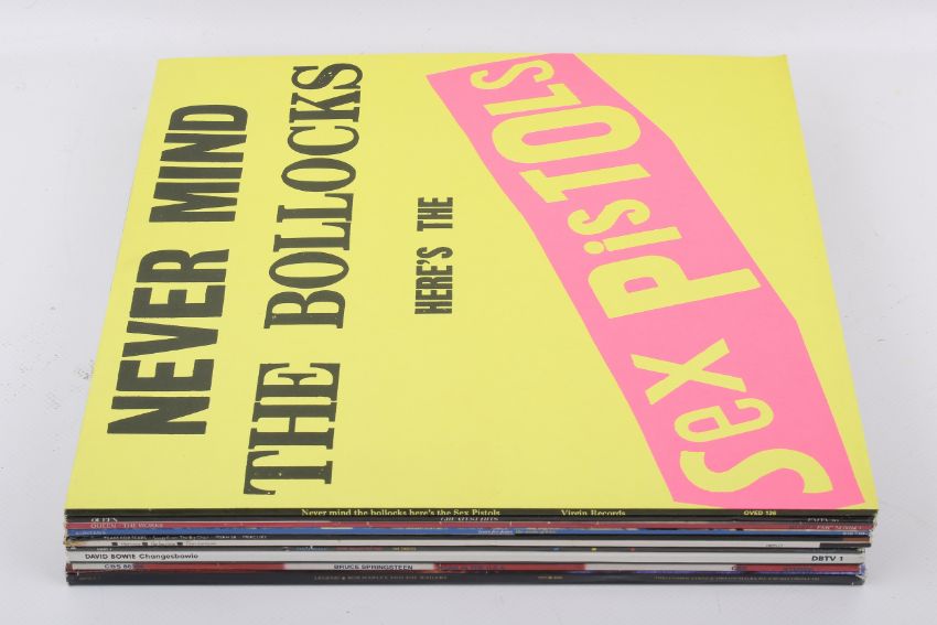 Ten assorted LP vinyl records mostly 1980s pop. Including Queen, David Bowie and The Police, etc.