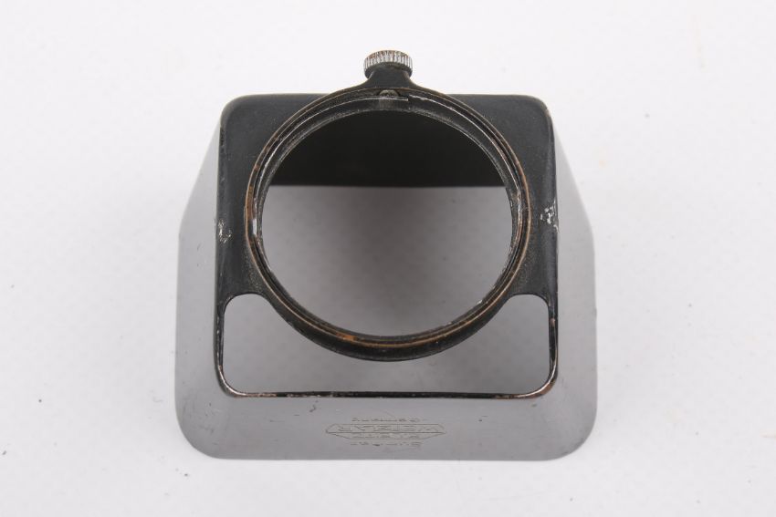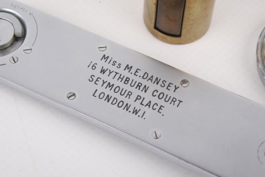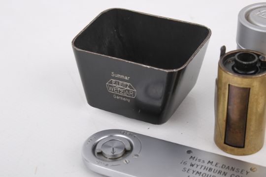 A small group of Leitz Leica accessories. To include a SOOMP Summar sun shade, a FILCA reloadable film casette with canister, a FIOLA 13055 R filter, a baseplate marked 'Miss M.E.Dansey, 16 Wythburn Court, Seymour Place, London, W.1', and more.