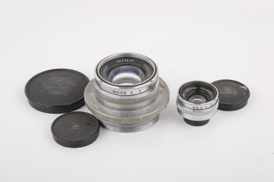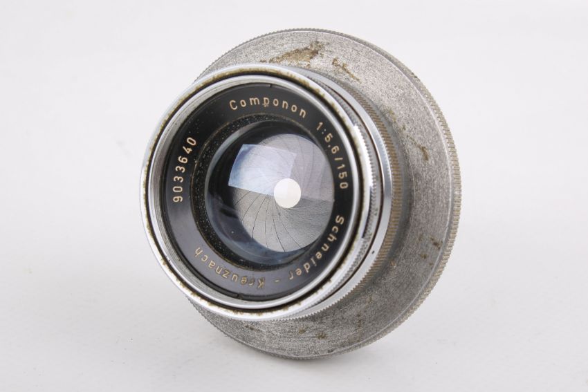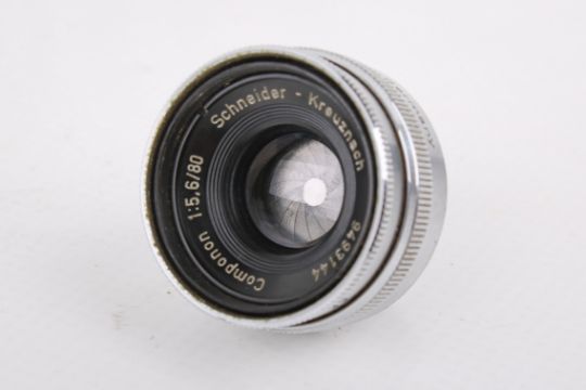 Two Schneider Kreuznach enlarging lenses. To include a 150mm f5.6 Componon, optics G, one fungus spore to rear element, functions well; and an 80mm f5.6 Componon, optics G/VG, functions well. Both with front caps, and the 150 with rear cap.