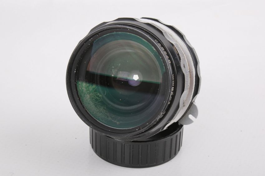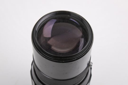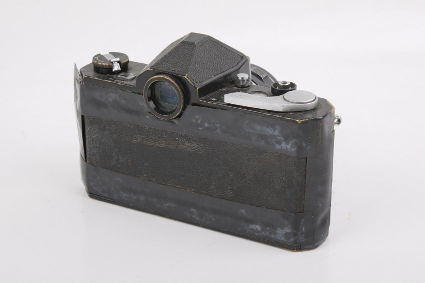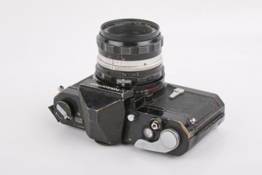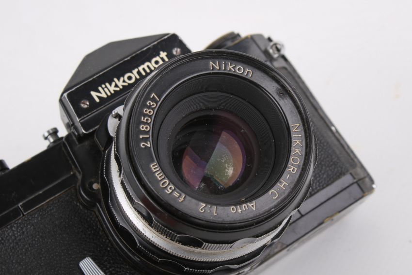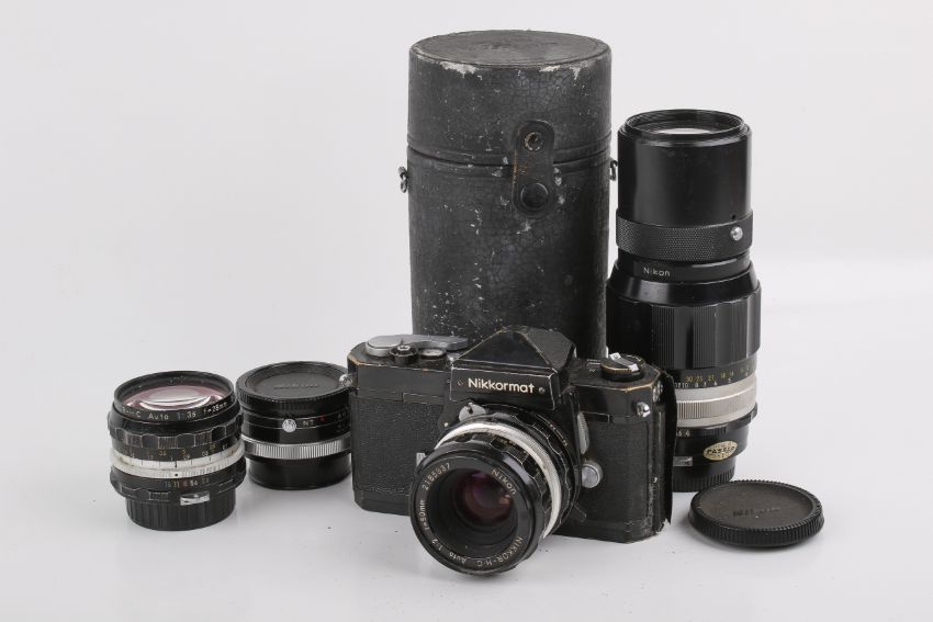 A Nikkormat FTN 35mm SLR camera outfit. Black. Serial number FT 4260283. With three lenses; A Nikkor-HC Auto 28mm f3.5, optics F, fungus to peripheral, functions well; a Nikkor-HC Auto 50mm f2, optics P, fungus, functions well, and a Nikkor-Q Auto 200mm f4, optics P, fungus, functions well. Together with a 2x teleconverter. Shutter working. Black tape around film door - likely light leak.