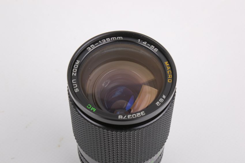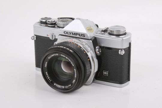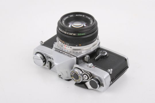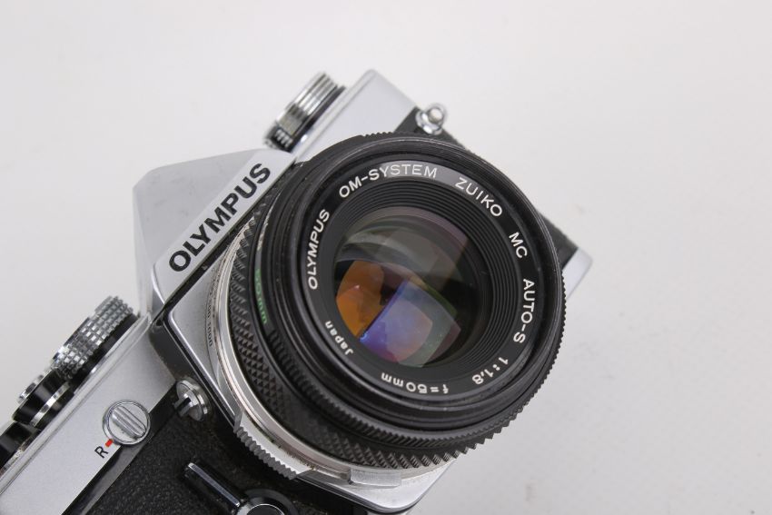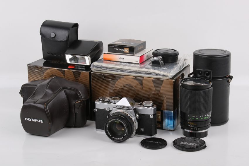 An Olympus OM-1N 35mm SLR camera outfit. Chrome. Serial number 1931357. With two lenses; an Olympus 50mm f1.8 Zuiko MC, optics F, fungus, functions well; and a Sun Zoom 35-135mm f4-5.6 MC Macro, optics G, light haze to peripheral of inner element, functions well. Together with an Olympus T20 flash, lens caps, filters, ERC, manuals, and makers box. Shutter working. Condition Report:The original polystyrene packaging is present for the camera body. Please see additional photos