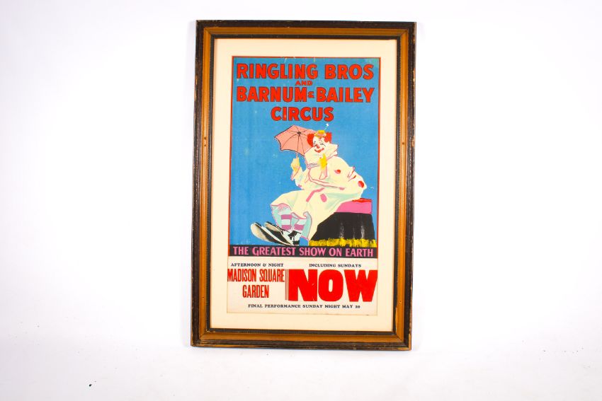 Ringling Bros and Barnum & Bailey Circus poster. Madison Square Garden, lithograph print depicting a clown with an umbrella, 49cm x 84cm, framed and glazed, 73cm x 109cm