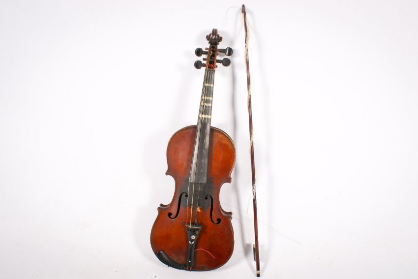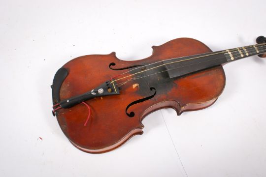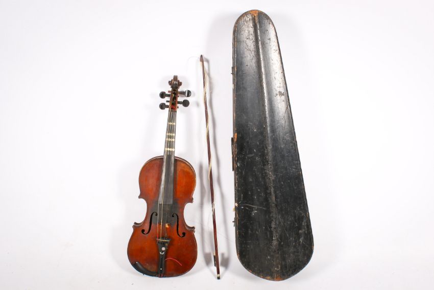 A 19th century violin labelled 'Antonius Straduarius Cremona 1690' in an ebonized wooden cased. With a 358mm two piece back and a bow (needs re-stringing)