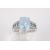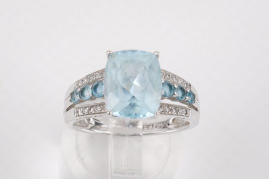 A white metal dress ring set centrally with one rectangular cushion cut topaz. The stone measuring circa 9.9mm x 8mm, shoulders further set with topaz and small diamonds. Marked 14kt and tested as such, size N1/2, gross weight 3.9g.