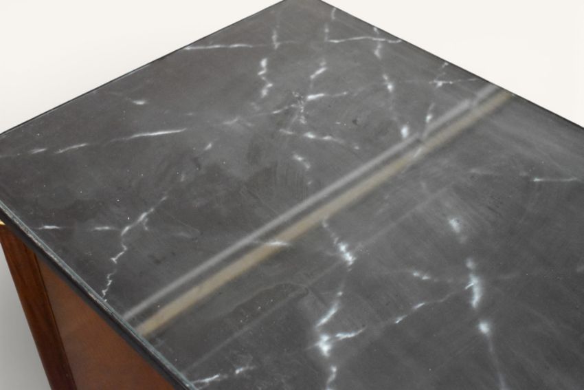 A contemporary Regency style marble top sideboard with checkerboard marquetry pattern doors. Having glass protector to the top, doors opening to reveal and open back to one side, raised on turned tapering supports with gilt detail. H85cm x W120cm x D55cm