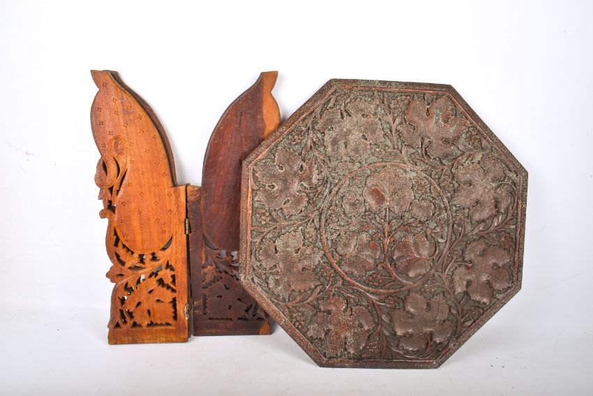 An Indian carved hardwood folding table. The octagonal top with grape and vine decoration. Diameter 46cm