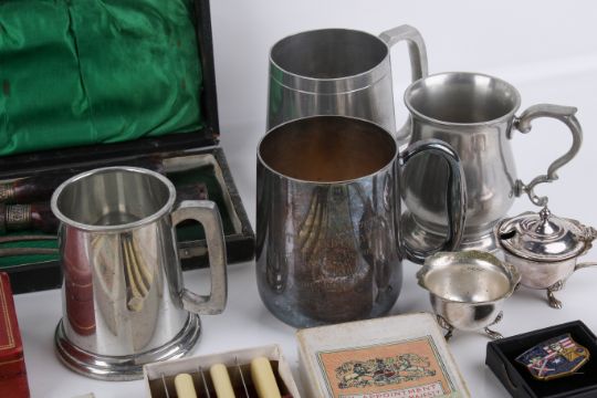 A small quantity of silverplated and other items. Including metal tankards, a three piece condiment set, boxed cutlery, two costume watches, etc.