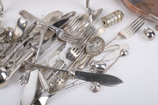 A group of silverplated items including cutlery and a large serving dish. Including Mappin & Webb cutlery, footed pierced small tray, etc.