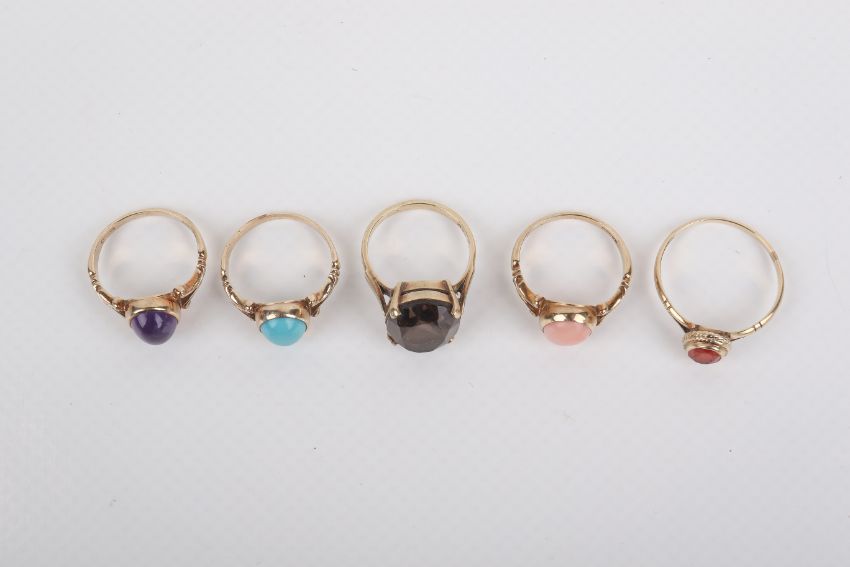 Five 9ct gold rings variously set with semi precious stones. Assessed as turquoise, quartz, coral and fire opal, various sizes, metal hallmarked or tested, gross weight 15.2g.