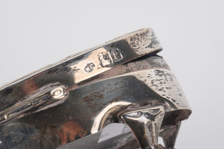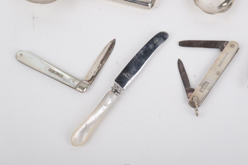 A collection of silver and white metal. Including an Edwardian oval trinket box, maker William Comyns & Sons Ltd, London 1902, embossed with a courting scene to the lid, on claw feet, lined in blue fabric, L10.5cm (AF), two spoons, 75.4g, a match case, 31.7g, two pen knives, etc.