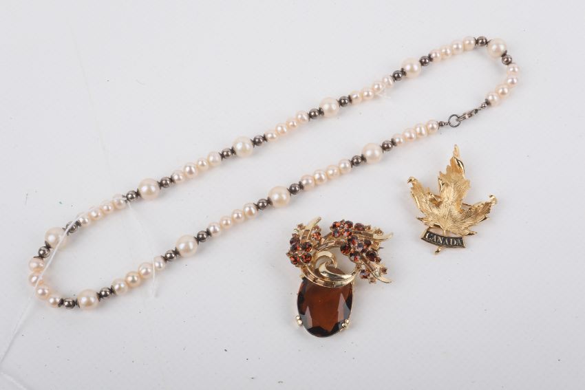 Three pieces of jewellery. Comprising a necklet of cultured freshwater (assessed) pearls, the largest of circa 9.5mm diameter, predominantly off round shape interspersed with silver beads, L48cm, clasp stamped '925'. Together with two gold plated brooches.