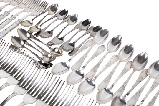 An extensive Spanish Meneses of Madrid silverplated canteen of cutlery in a fitted teak case. For twelve (one large fork missing), comprising 150 pieces, together with additional set of eight coffee spoons and seven coffee spoons.