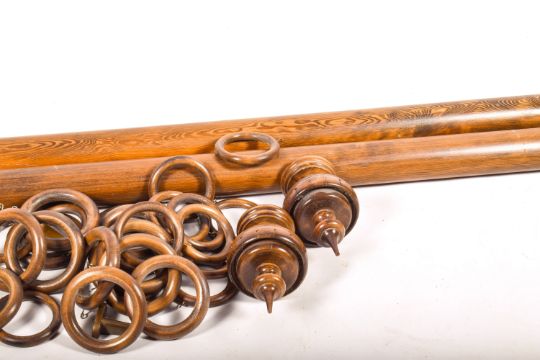 Two large pine curtain poles with rings. Poles measure 180cm and 163cm long, each finial 23cm long