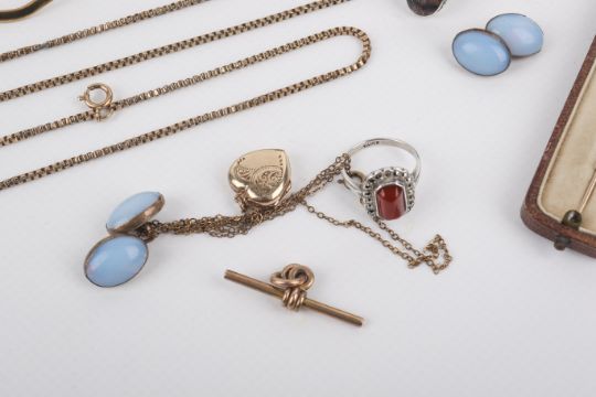 A small group of yellow metal items. Including an unmarked tie pin, head testing as 9ct gold, whole pin weighing 2g, together with yellow metal pince nez and a broken yellow metal chain unmarked but testing as 9ct gold, this weighing 16.1g, together with a gold plated T-bar, yellow metal choker, cufflinks and two silver rings, etc.