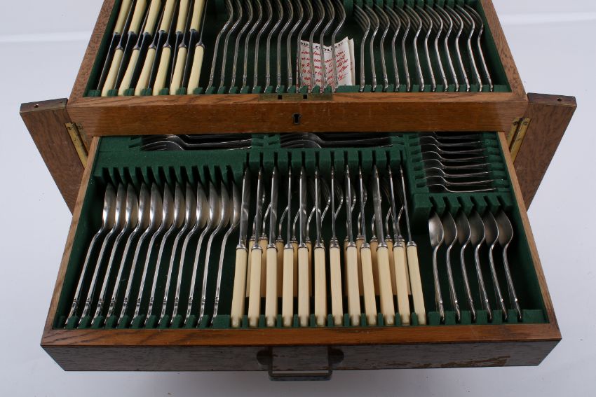 A vintage John B Chatterley & Sons three-tier canteen of cutlery for twelve. In an oak canteen.