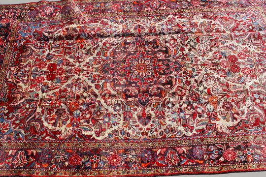 A 20th century Persian Heriz rug. The central panel featuring a scrolling blue medallion on a cream ground heavily decorated with flowers and foliage, surrounded by a blue, red and orange floral border, cream tassels to either end, 250cm x 150cm.