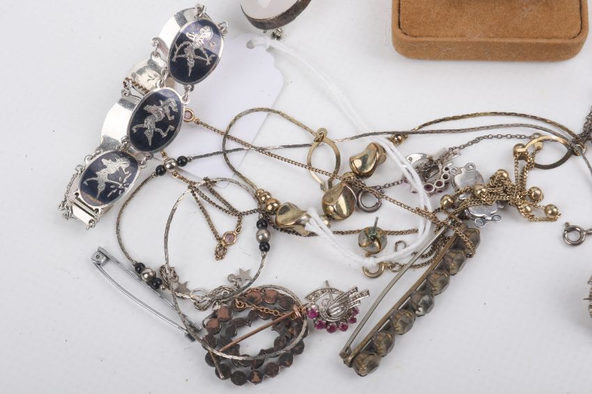 An assortment of silver and white metal jewellery. Including a 19th century white metal and paste necklace, a pair of stone set earrings, a white metal and enamel bracelet stamped 'Sterling', 15.1g gross, a stone set bracelet modelled as leaves, marked 'Sterling', 12.3g gross, a white metal brooch set with a cabochon stone, pairs of stone set earrings, etc.