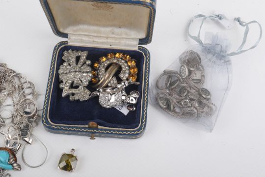 An assortment of silver and white metal jewellery. Including a necklace inset with oval panels, marked '800', 36.1g gross, five pendants set with stones, 20.5g gross, two vintage brooches marked 'Sterling' and a quantity of chains and pendants, 62.3g