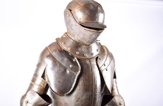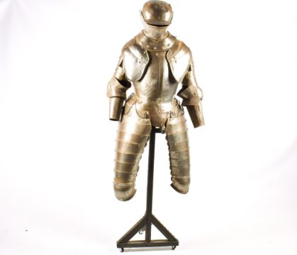 A reproduction part suit of armour. The metal structure mounted on a wooden stand, H185cm.