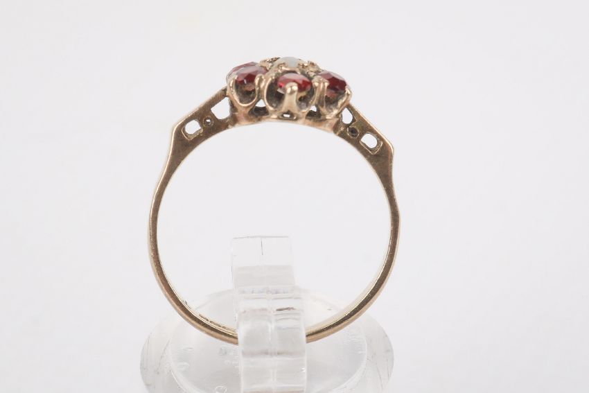 A 9ct gold and garnet ring. Of flower form with round cut garnets, pierced shoulders, hallmarked, size M1/2, gross weight 2g.