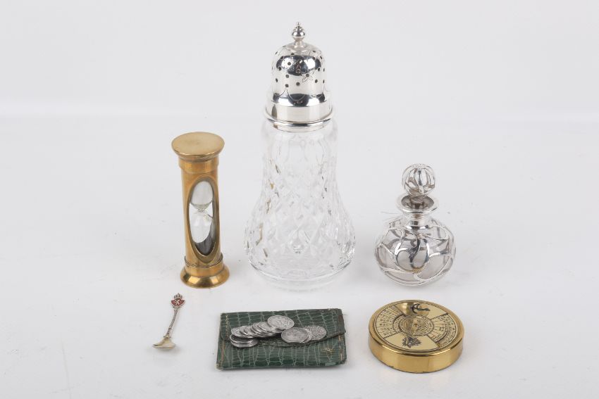 An assortment of collectables. Comprising a silver topped shaker with a glass base (hallmarks rubbed), a glass scent bottle with white metal inlay, a brass egg timer, brass desk calendar, a white metal and enamel spoon and a quantity of coins.