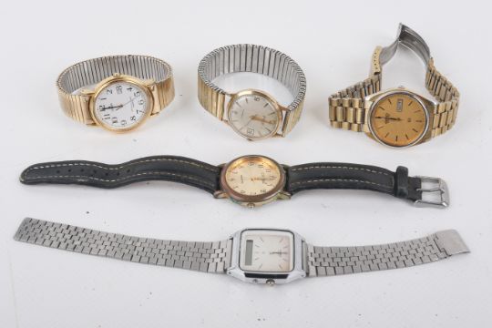 Five gentleman's wristwatches. Including an Accurist antimagnetic watch, the dial with Arabic and baton hour markers and a date aperture, in a 9ct gold case attached to a fixo-flex strap, a Seiko with a quartz movement, a Casio with a stainless steel case and strap, numbered '607957', a Lorus and a Citron.