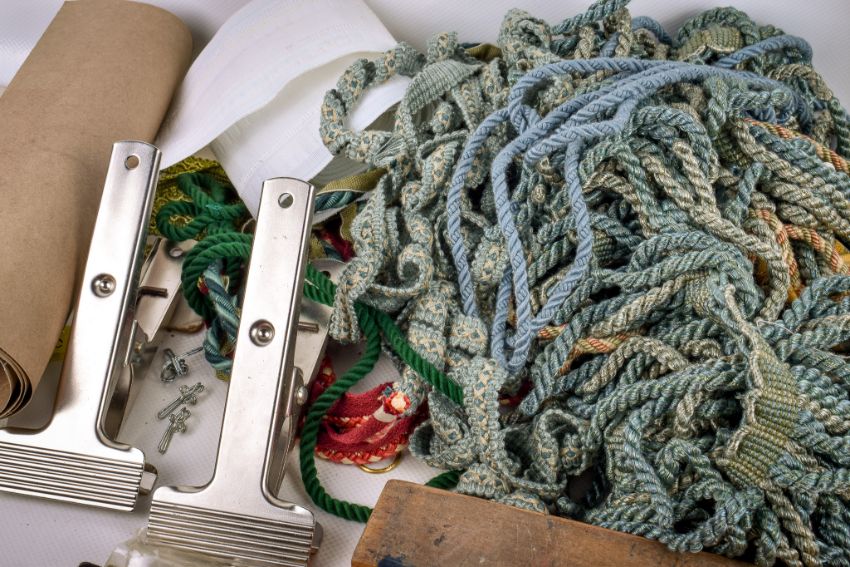 An assortment of sewing tools and equipment. Including a 'Pin-it' skirt marker, hooks, velcro, lengths of curtain track, trims, etc.