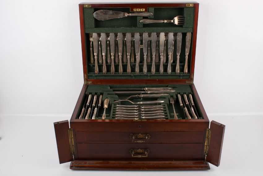 A large canteen of Community silverplated cutlery. Mostly for twelve, in a mahogany two drawer canteen chest.