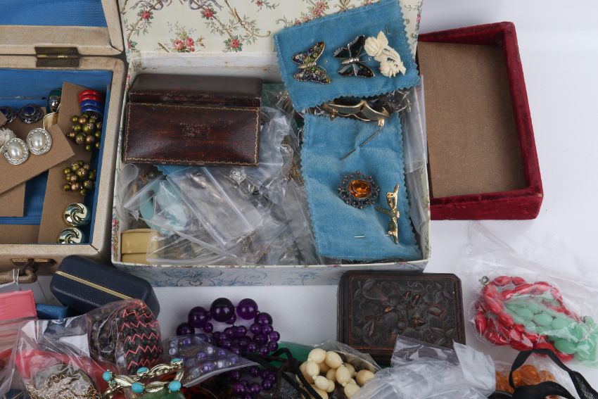 A large quantity of costume jewellery and jewellery boxes. Including assorted clip earrings, a large collection of beaded necklaces, bangles, a little silver, etc.