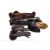 An assortment of ladies' fashion accessories. Including a vintage brown fur shrug, a pair of black leather gloves with fur trim and cashmere lining, a faux fur hat, etc.