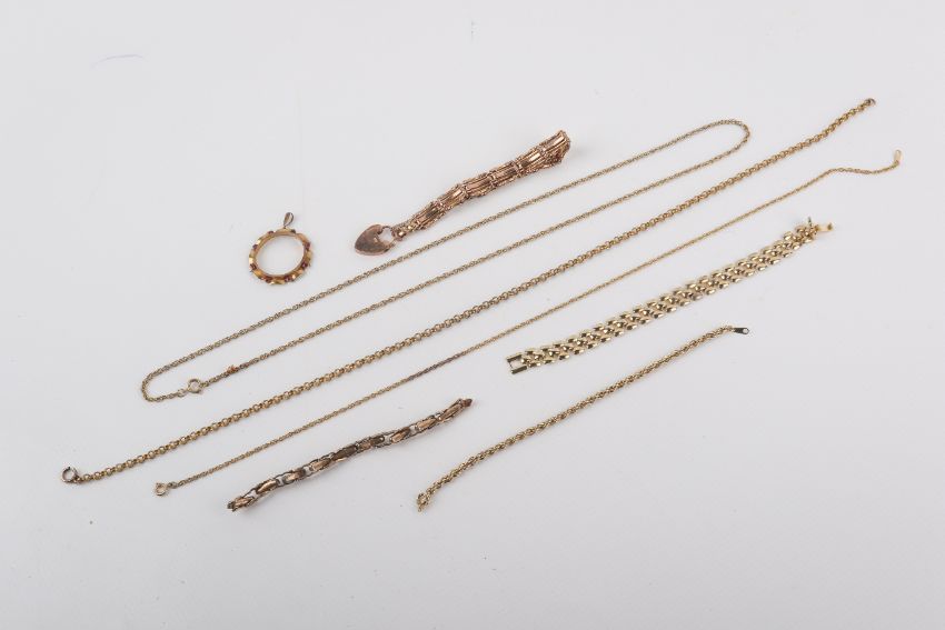 A group of gold and yellow metal jewellery. Comprising a wreath brooch mount marked 9c, and a bracelet with heart locket marked 9c, these all weighing 18.6g; together with five yellow metal chains and a part watch strap.