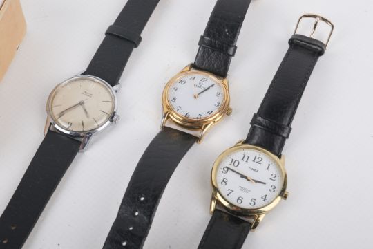 Six assorted wristwatches and a vintage alarm clock. Including Timex, Lorus, Avia Olympic, etc, the clock in a faux tortoiseshell case, in original box.