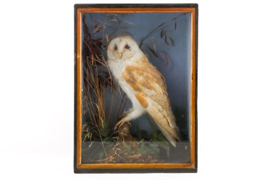 Taxidermy - An early 20th century taxidermy Barn Owl (Tyto alba), cased. Posed in a naturalistic setting with foliage, wooden case with glazed front. H45cm x W33cm x D16cm. (No postage)CITES Annex A Appendix II (pre-1947 exempt)Not for sale to buyers outside the UK