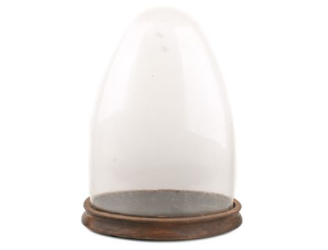 A large glass dome and oval wooden base. Glass H62cm x W42cm x 23cm. (No postage) Condition Report: Appears in a fair condition for its age, no chips or cracks