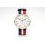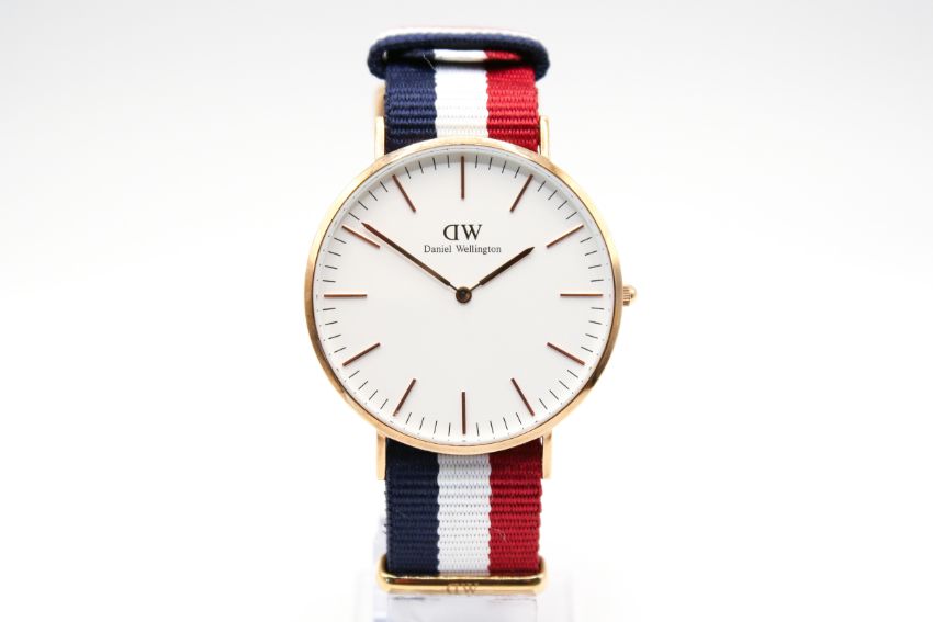 A Daniel Wellington wristwatch. With rose coloured markers and case, case diameter 4cm, S/N 01030072684, with tricolour canvas strap, in a named box.