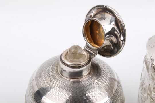 Three silver mounted glass pots. One with an engine turned hinged lid over silver mounted circular shoulder, a smaller example with silver collar, the third with a plain silver neck and shoulder with rubbed marks. Largest with stopper H18cm.