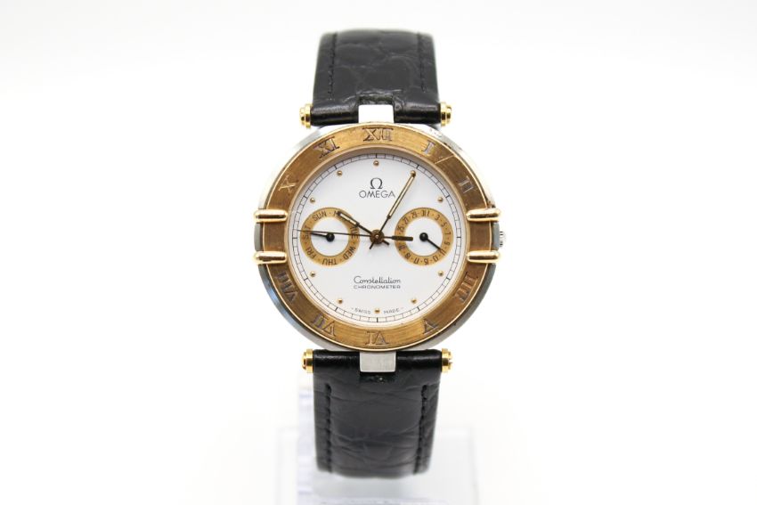 An Omega Constellation chronometer quartz wristwatch. Bi-colour metal case, gilt markers and day and date dials to the white face, case diameter 3.4cm, with black leather Omega strap, paperwork, in an Omega box.