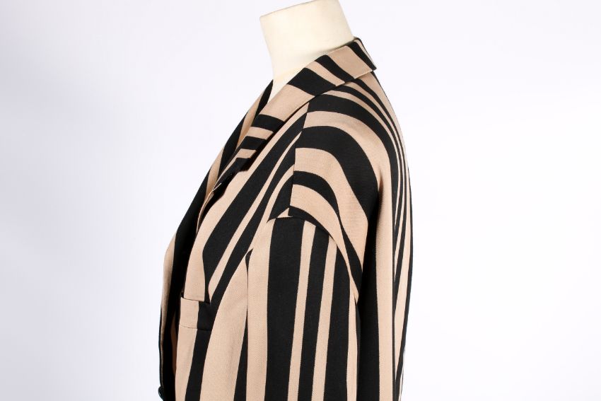A gentleman's Moschino Italian jacket. Constructed of striped fabric with a numerical pattern around the hem, lined in black fabric, L80cm x chest W51cm