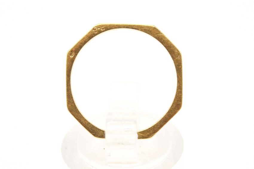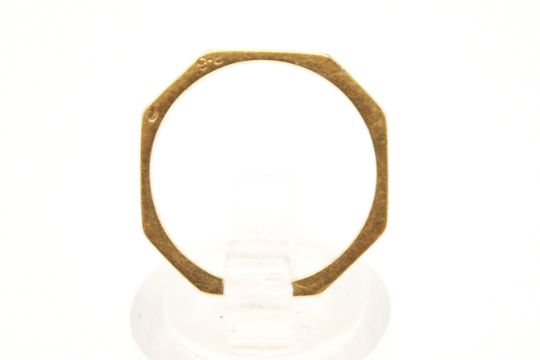 A yellow metal octagonal profile band ring. Undecorated, marked 750 and testing as 18ct gold, size M, weight 2.5g.